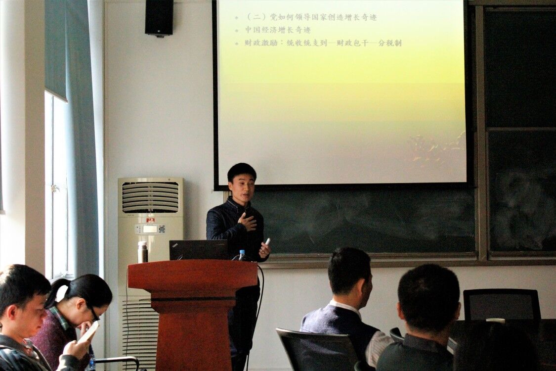 12月5日下午,为深入学习贯彻落实党的十九大精神,我院在307会议室召开十九大精神学习讲座。我校政治与公共管理学院的公共管理硕士教育中心副主任赖诗攀教授受邀出席并作出《党的建设与国家治理现代化》主题讲座,出席本次座谈会的有院党委书记林诗锋、学院副院长黄建新以及党政联合扩大会议成员。