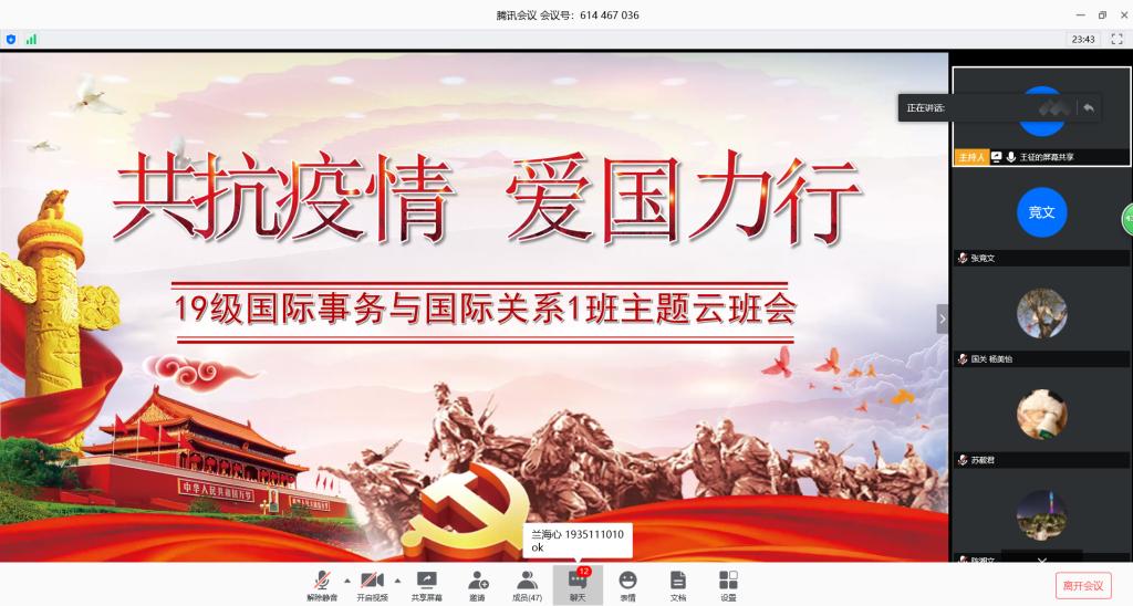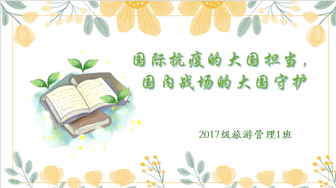 为深入学习贯彻习近平总书记关于疫情防控工作的重要指示精神,坚决贯彻党中央关于新冠肺炎疫情防控的各项决策部署,加强新冠肺炎疫情防控期间学生思想引领,进一步激发青年大学生的责任担当,进一步增强学生的四个自信,坚决打赢疫情防控的人民战争、总体战、阻击战,深入推进爱国主义教育,我校于4月1日—4月30日组织了各班级开展“共抗疫情,爱国力行”主题云班会活动。