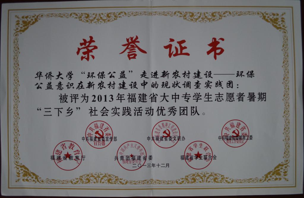 会上对在上年度社会实践中表现突出的先进集体和个人进行表彰。其中“环保公益”走进新农村建设——环保公益意识在新农村建设中的现状调差实践团和黄剑涛同学分别获2013年福建省大中专学生志愿者暑期“三下乡”社会实践活动优秀团队和先进个人称号。