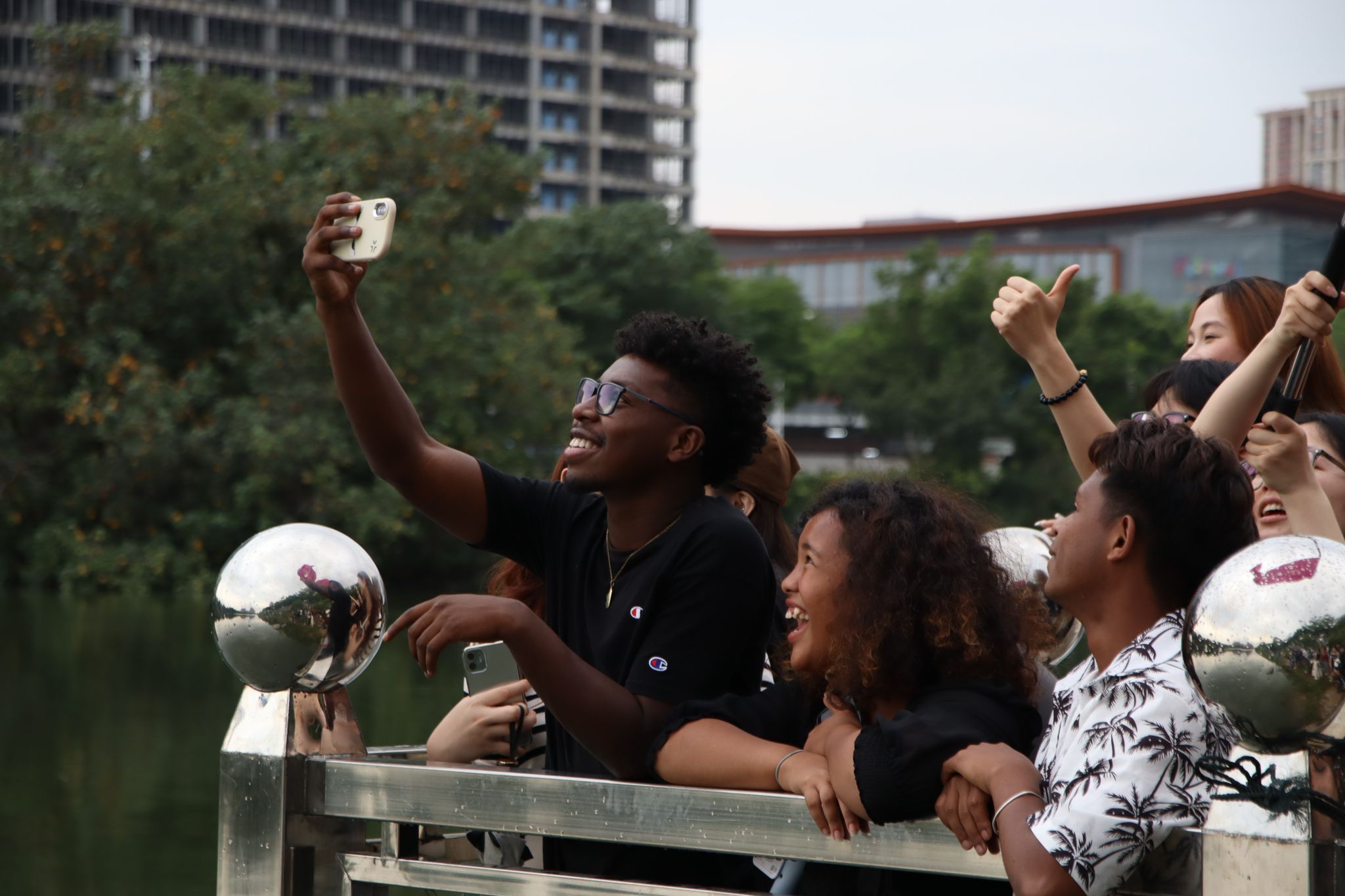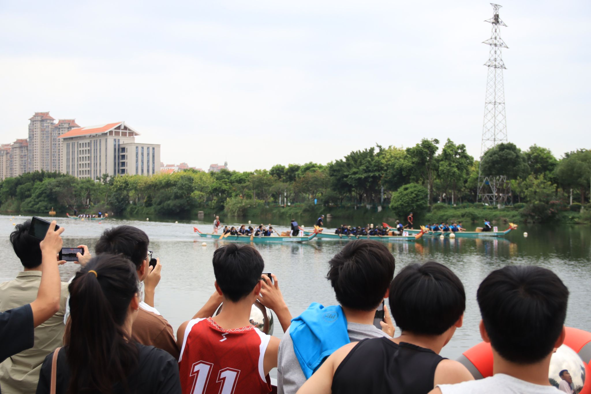 境内外学子在岸边为比赛加油呐喊
