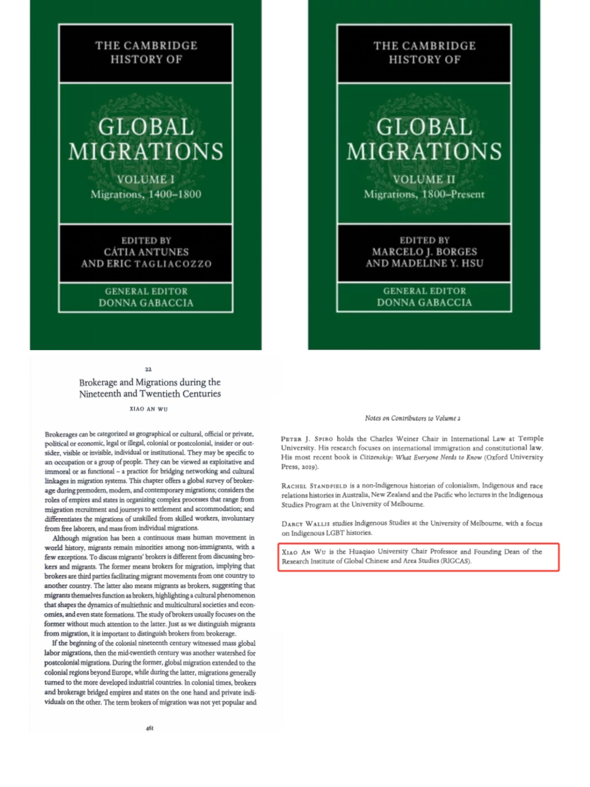 Gabaccia)教授担任总主编,剑桥大学出版社出版,汇集了全球61位学者参与撰写,其中我校吴小安教授作为中国大陆唯一受邀者,参与第二卷第22章节《19和20世纪中介与移民》的撰写。