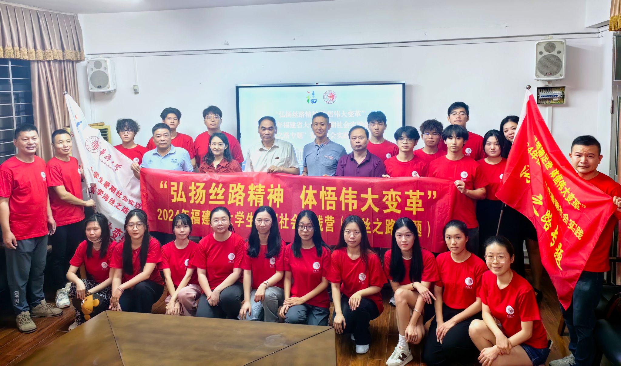 出征仪式上,副校长王秀勇分别为省级示范实践团队、马克思主义学院轻骑兵宣讲团、华侨大学习近平新时代中国特色社会主义思想读书社、华侨大学马列经典读书社授出征旗。