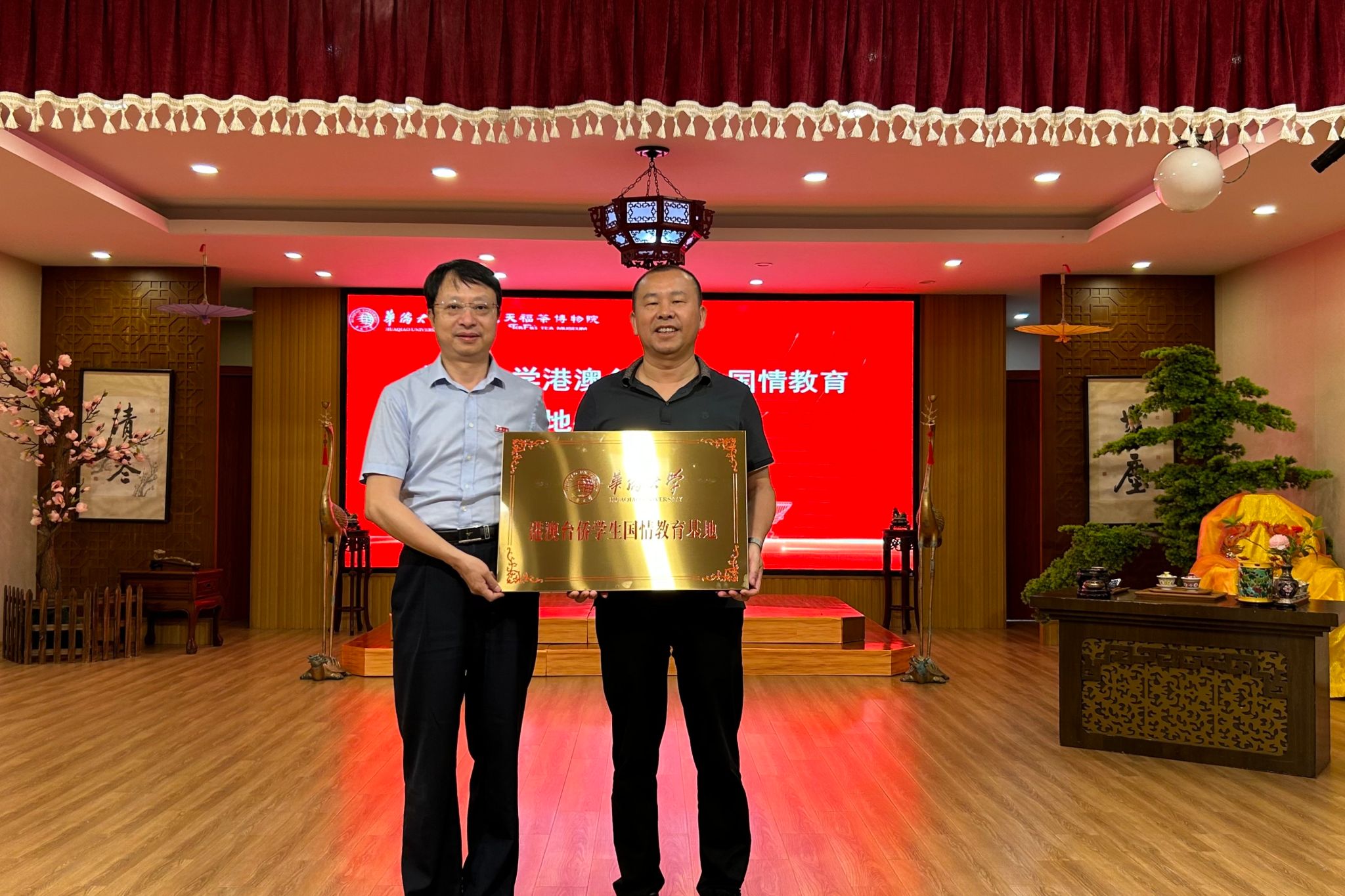 活动期间并在天福文化产业园举行了国情教育基地授牌仪式。计算机学院党委书记陈荣美、天福集团总管理二处副总经理林逢元、天福茶博物院副院长王瑞香出席仪式。双方表示,天福茶博物院作为传播茶文化的重要平台,将以“文化赋能+实践育人”的方式,为青年学子厚植家国情怀、提升综合素养提供有力支撑。双方将以此次基地共建为契机,在港澳台侨学生人才培养与中华文化传承等方面开展深入合作。
